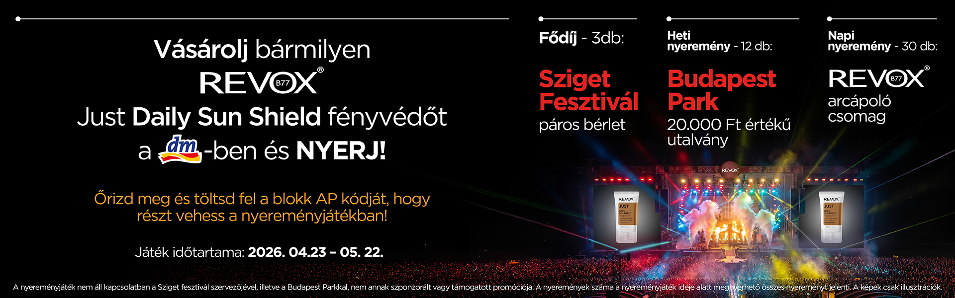Vásárolj a dm Kft. magyarországi üzleteiben, vagy az online webshopjukon keresztül 1 db bármilyen Revox Just Daily Sun Shield fényvédő terméket 2026. április 23. és 2026. május 22.-e között, és tiéd lehet a 30 db Revox arcápoló csomag, a 12 db 20.000 Ft-os Budapest Park utalvány, vagy a 3 db páros Sziget fesztivál bérlet egyike!